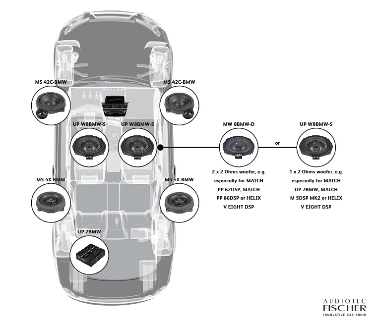 Niemniej jednak te subwoofery są również doskonale przystosowane do uniwersalnych zastosowań. Dzięki bardzo małej głębokości montażu, niezwykle kompaktowe, zamknięte obudowy nie stanowią żadnego problemu, podczas gdy powiększona cewka głosowa 1,7” / 42,5 mm zapewnia obsługę dużej mocy. Dzięki pojedynczej cewce głosowej 1 x 2 Ohm UP W8BMW-S są idealnym zamiennikiem oryginalnych subwooferów systemu dźwiękowego BMW HiFi. Ponadto są idealnym towarzyszem dla naszego wzmacniacza MATCH Upgrade MATCH UP 7BMW i MATCH UP 7DSP.