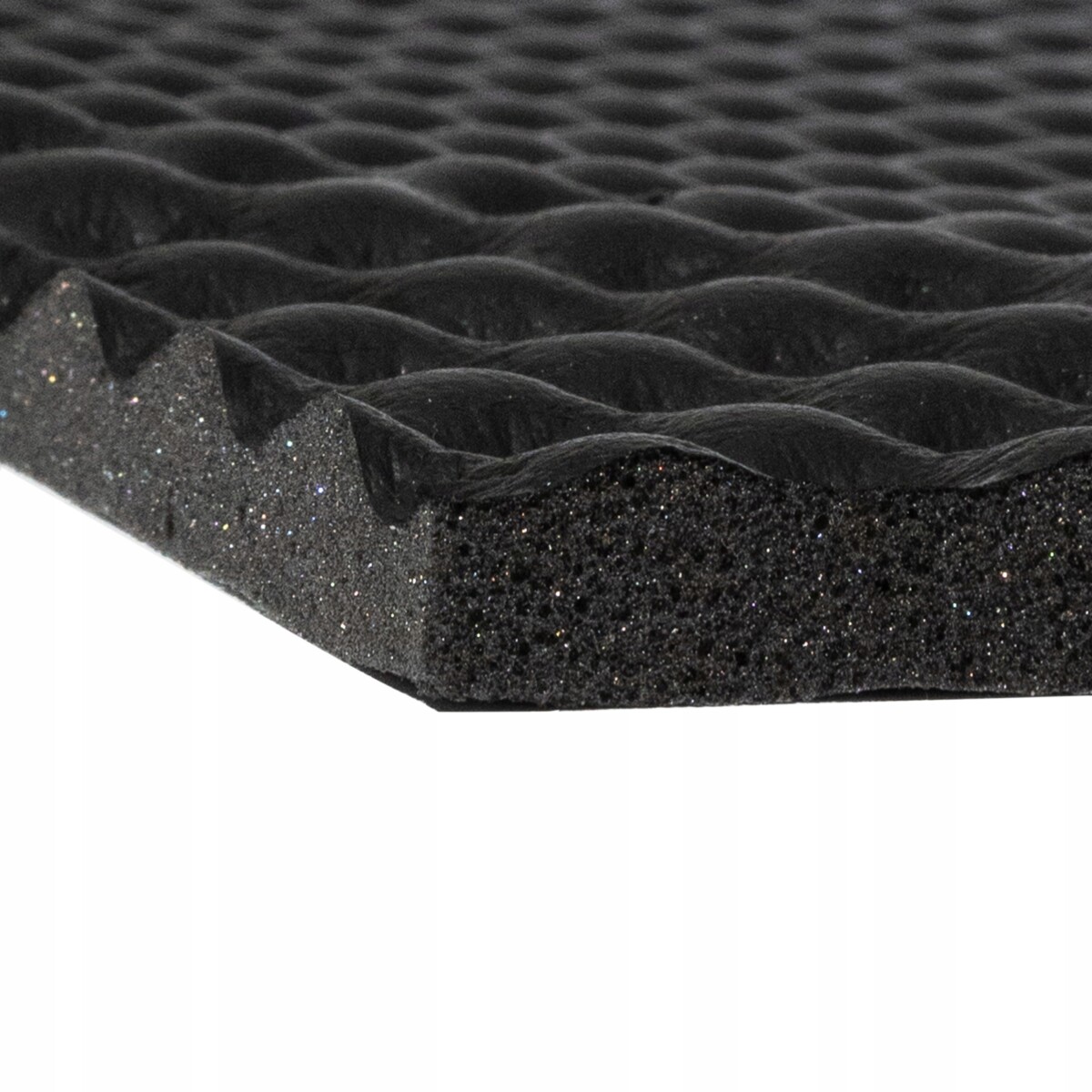 • ➡️ Otwarte komórki maty NoiseCUT efektywnie pochłaniają dźwięk dzięki swojej porowatej strukturze, podczas gdy zewnętrzna folia poliuretanowa działa jak akustyczna membrana, odbijając dźwięki do wewnętrznej struktury, gdzie są one częściowo absorbowane.